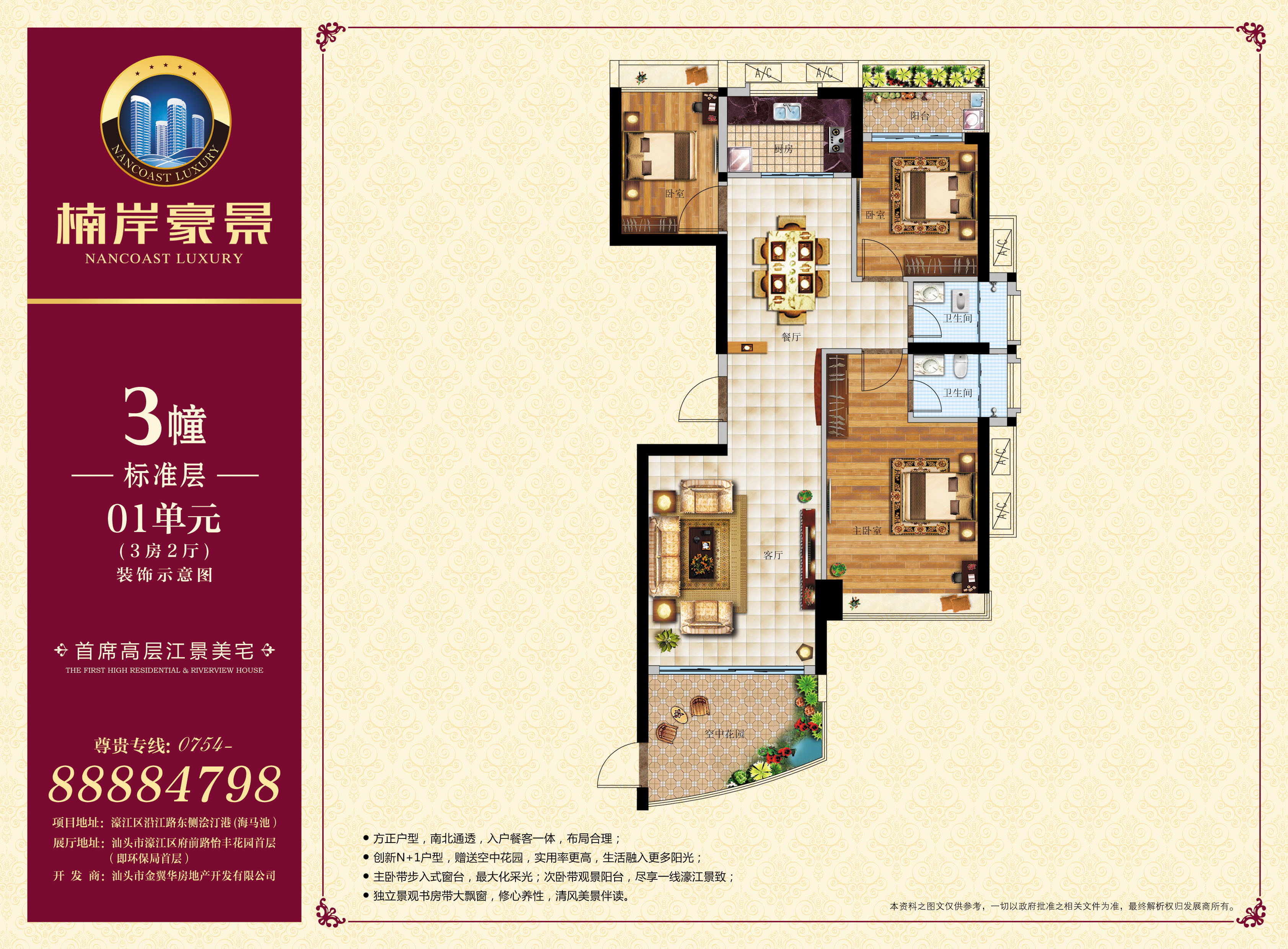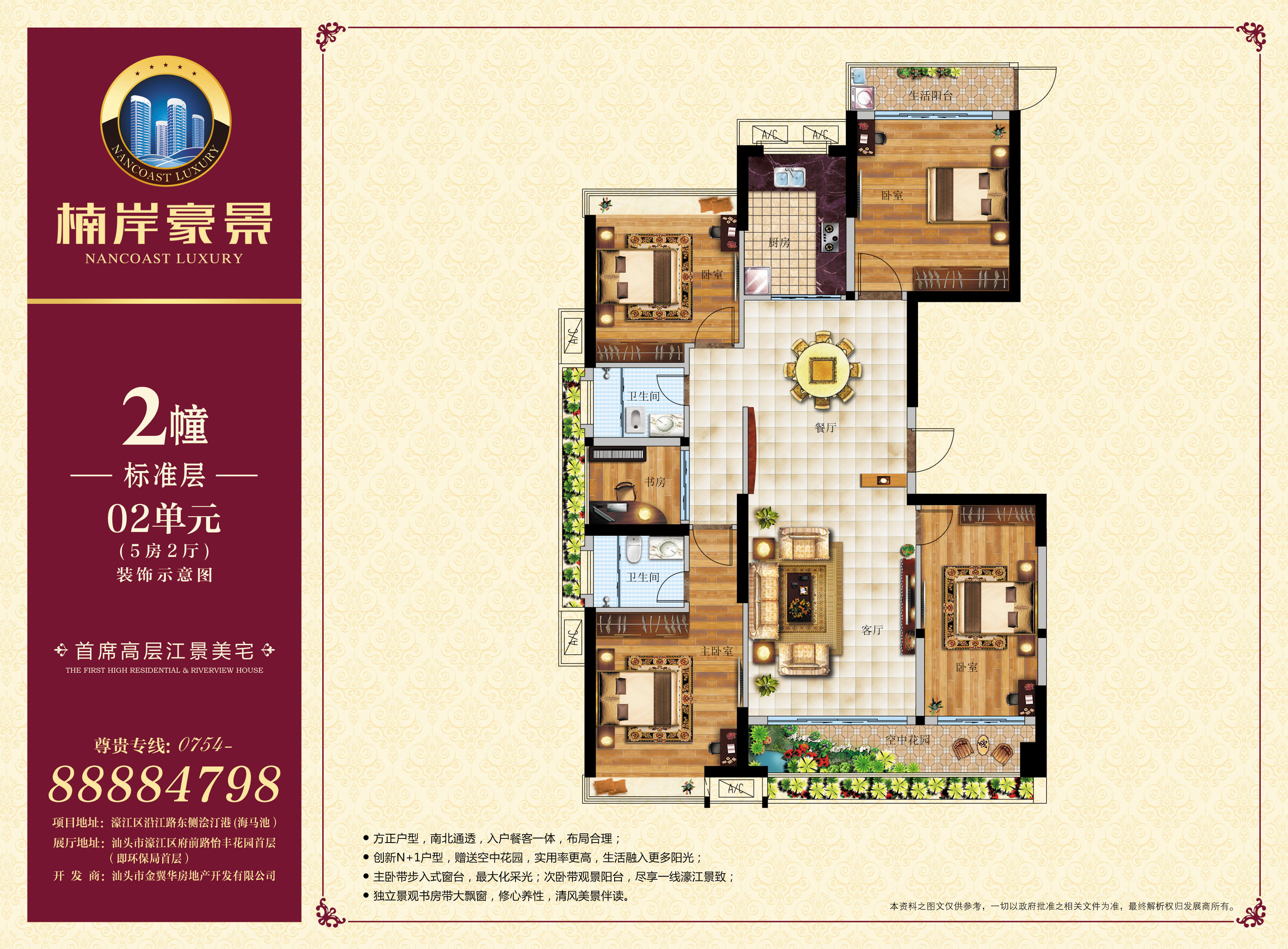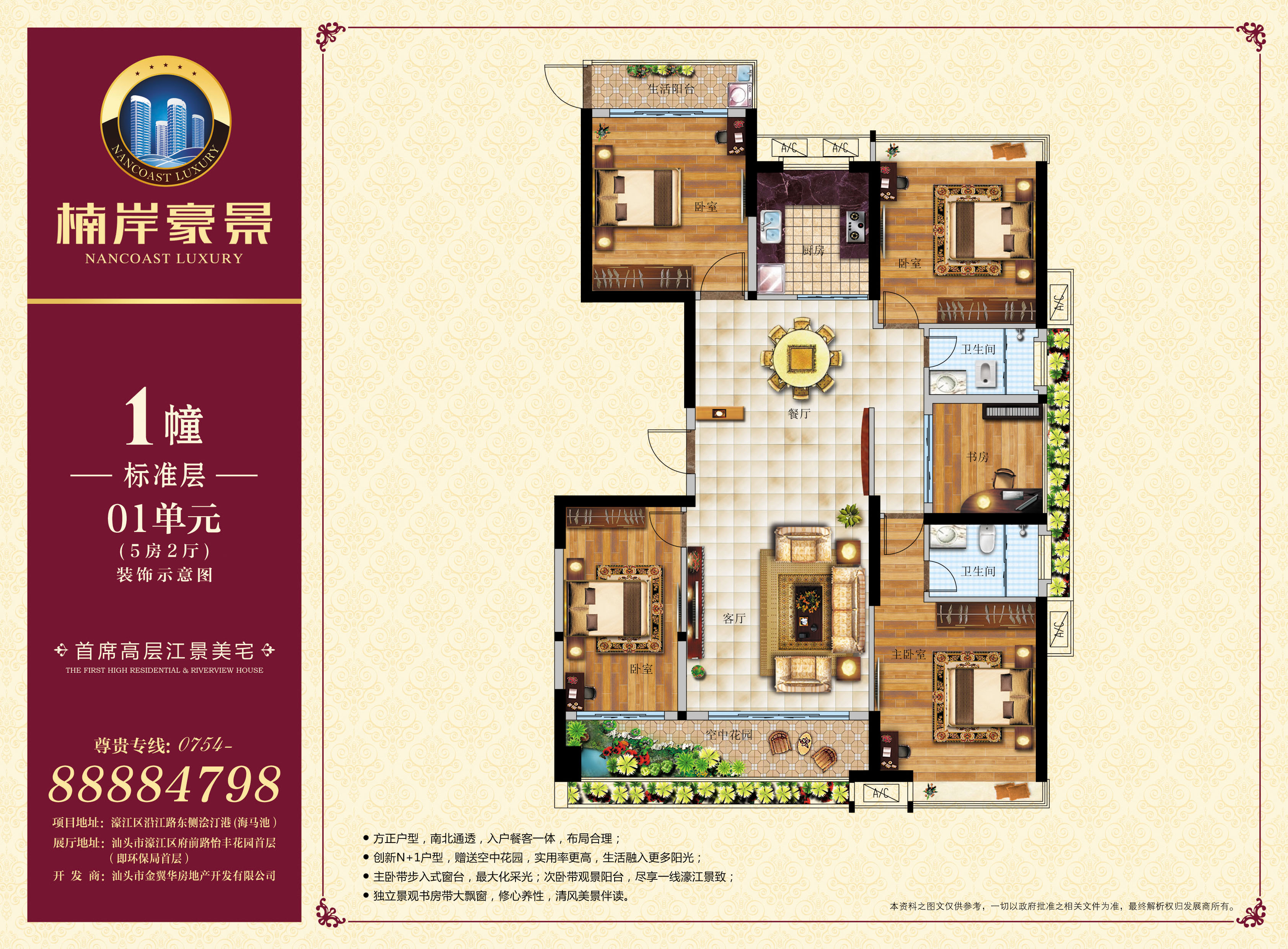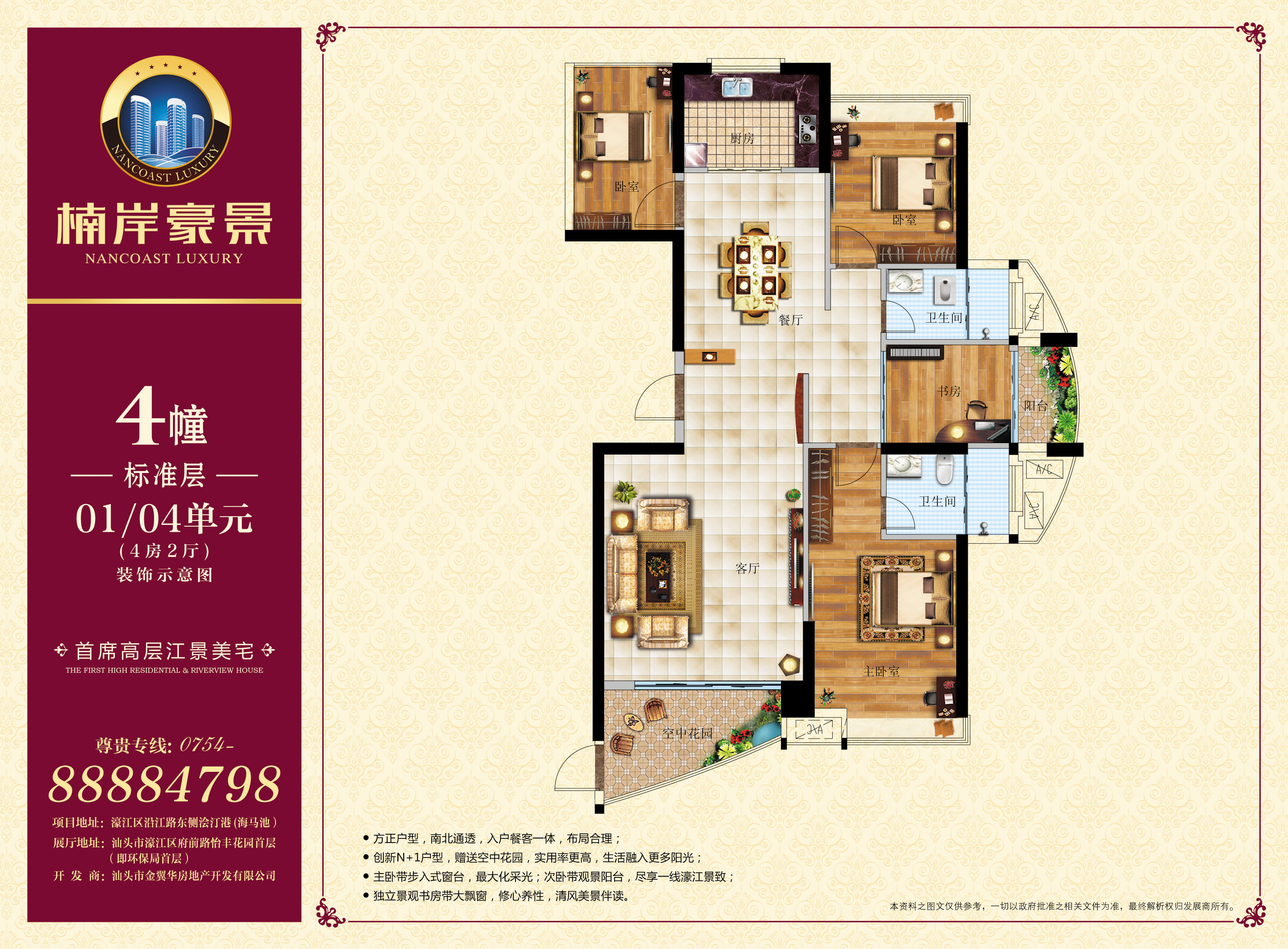 楠岸豪景位于濠江区沿江路南段浍汀港(海马池粮仓),项目占地面积7843.95平方米, 约合11.77亩,建筑面积41837平方米,容积率4.5,绿化率约30%。 项目拥揽一线濠江美景,环顾一城璀璨繁华。项目整体坐北朝南,上风上水,由四栋21—25层的高层建筑构成,打造濠江首席25层地标性建筑,领略城市至高生活的非凡气度。项目建筑外轮廓呈圆形,为城市上空增添柔和的弧线,引领建筑美学风尚,建筑内轮廓呈方形,实用大气,体现尊贵世家的处世哲学,彰显至臻生活的优雅气度。 楠岸豪景,户型方正,南北通透,布局合理,面积涵盖 115m2—165 m2之间的三房、四房和五房,融合入户花园、景观阳台、步入式飘窗等主流设计,定义阔宅尺度,奢享多变空间,成就濠江首创“N+1”户型,缔造江岸人居范本。 楠岸豪景,演绎东南亚园林风格,绽放都市绿意生活。 项目社区将配套濠江豪华活水循环泳池,打造亲水生活主题园林。项目前庭广场已列入政府改造计划,未来将改造成为公共花园,内外景致辉映,双园惬意生活,成就濠江的公园型社区!